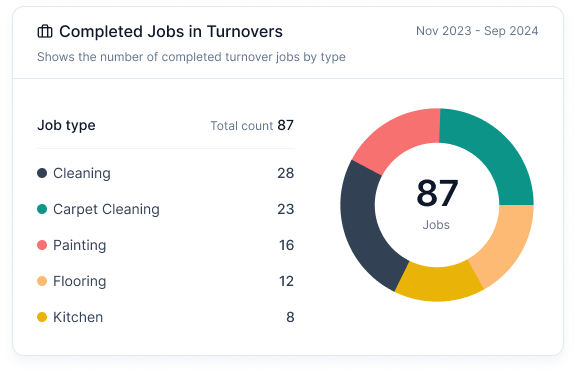Completed Jobs in Turnovers: Pie chart showing completed jobs by type (e.g., Cleaning, Carpet Cleaning, Painting, Flooring, etc.).