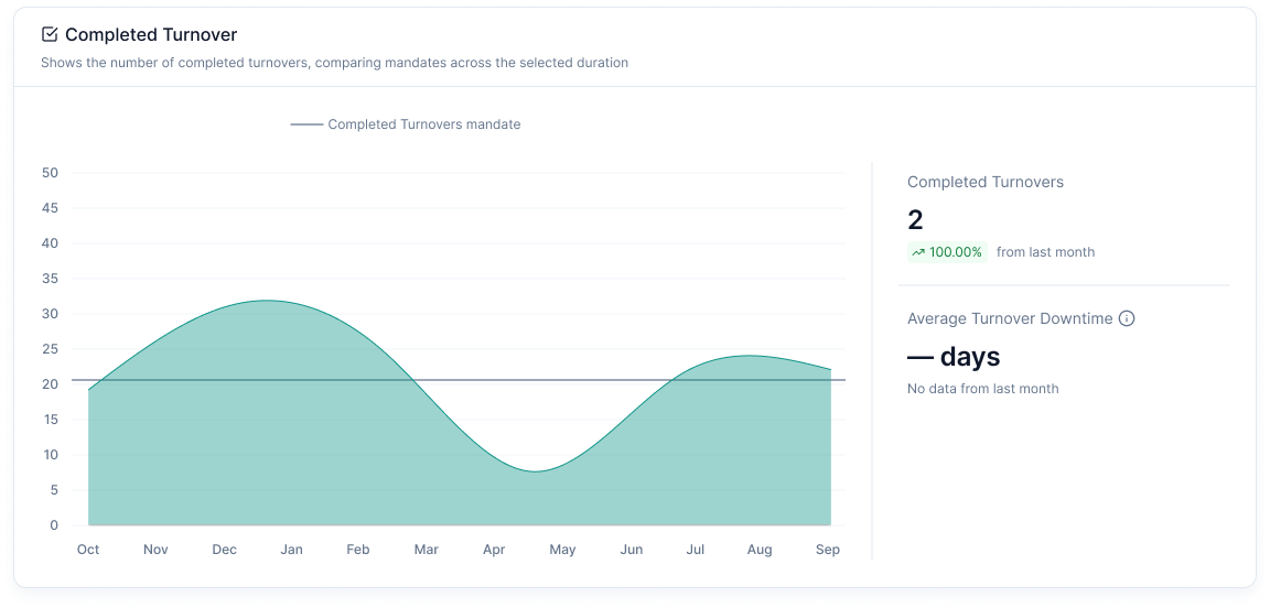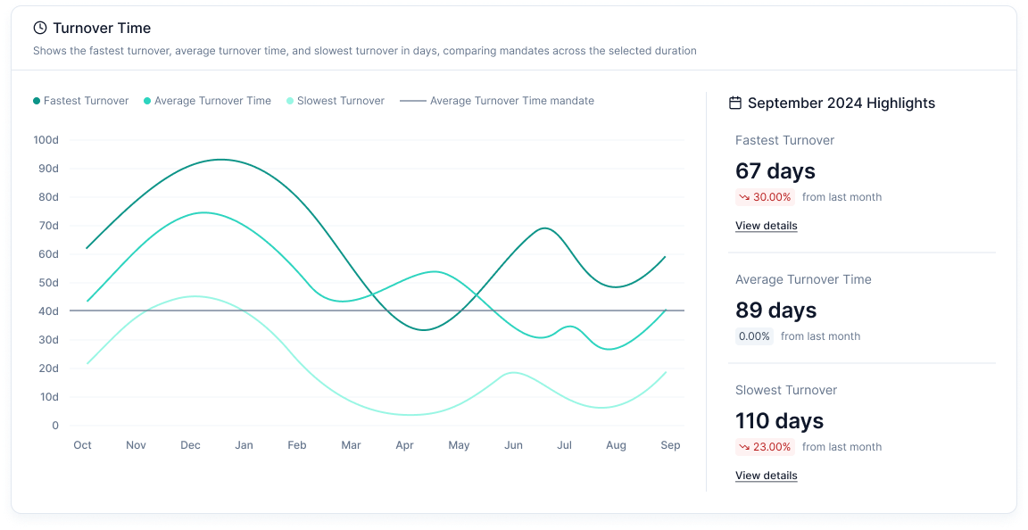 - Average Turnover Time: Shows the average duration taken for turnovers, highlighting changes from the previous month.
