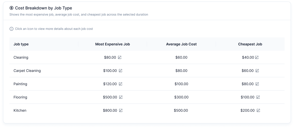 Cost Breakdown by Job Type Table: A tabular breakdown of the most expensive, average, and cheapest job costs.