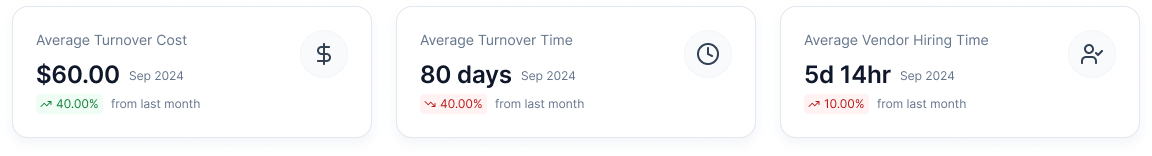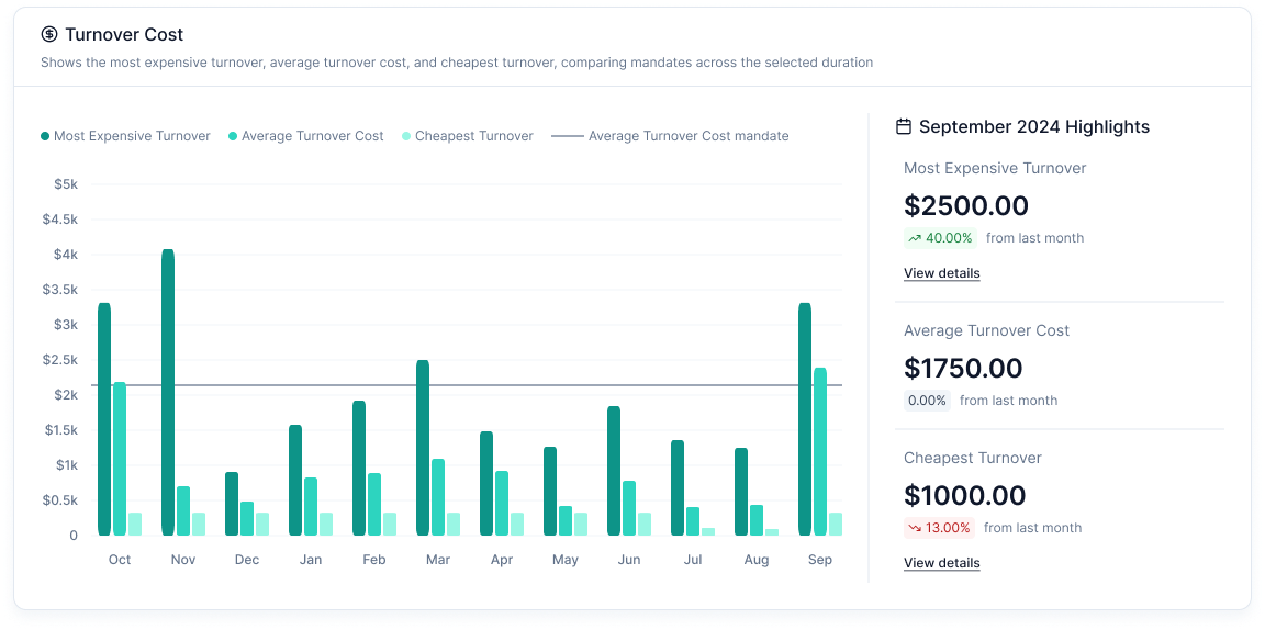 - Average Turnover Cost: Displays the cost associated with turnovers for the selected duration, with a comparison to the previous month.