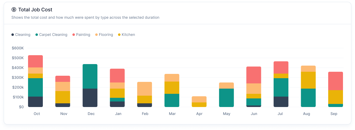 Total Job Cost Chart: A stacked bar chart visualizing the total cost spent per job type over time.