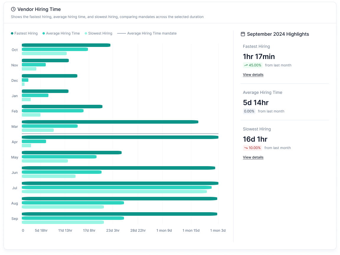 Vendor Hiring Time: A bar chart tracking the fastest, average, and slowest hiring times.