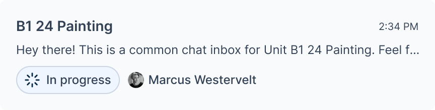 The chat card has the title of the associated job. It also has other information like the vendor's name, and the last message sent in the chat. It also includes the status of the job in the form of a chip.