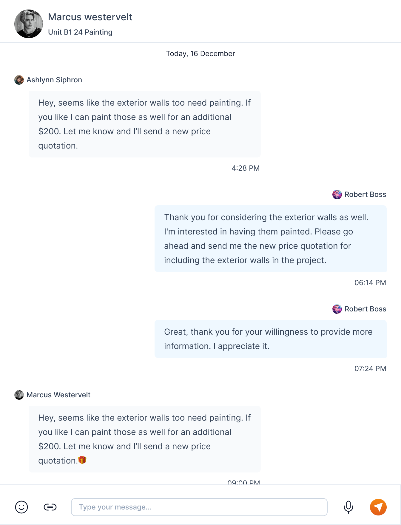 You can also send attachments by clicking on the attachment icon, emojis by clicking the emoji icon, and voice messages by clicking the mic icon.