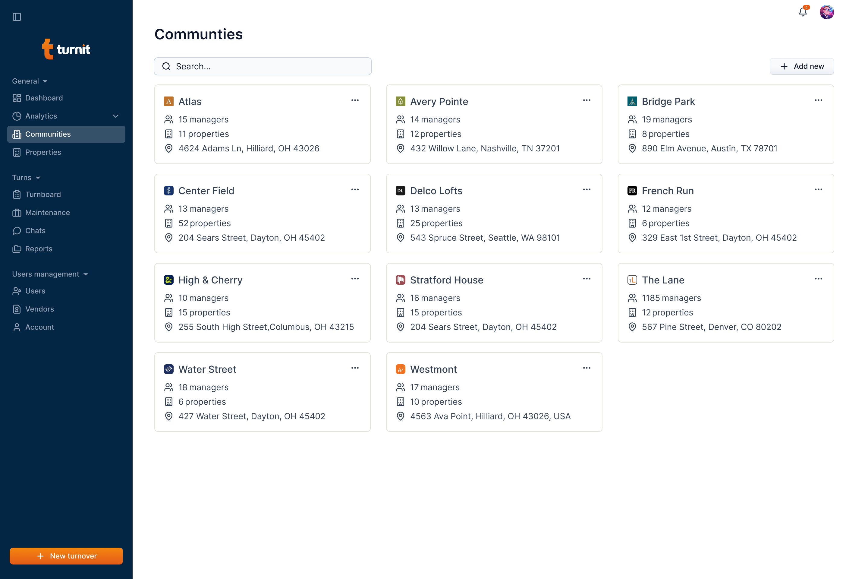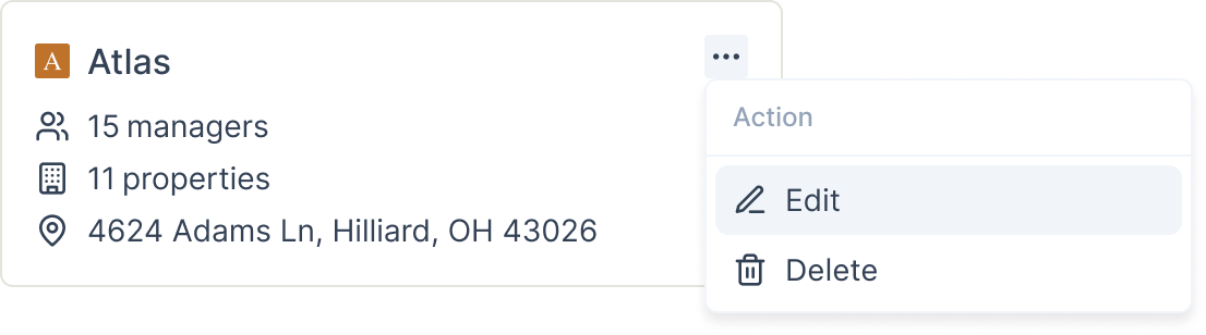 A community is represented by a card. The card contains the community name with the logo, the number of managers, the number of units, and the address of the community along with the three dots icon that allows you to edit or delete the community.