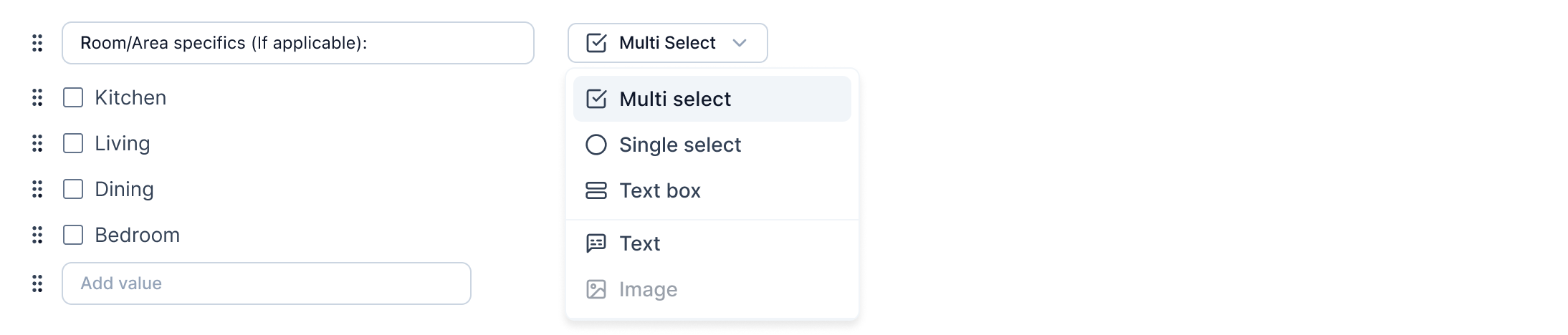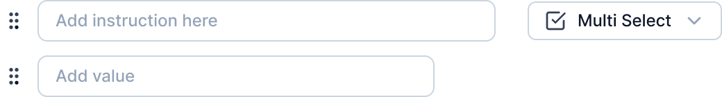 You can select the type of instruction from the dropdown menu. The types of instructions available are: Single select, Multi select, Text box, and Text.