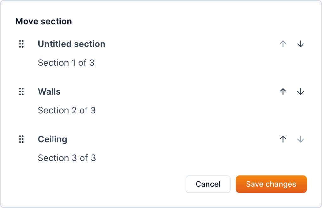 When you click on the Move section option, it will open a popup which provides you with an interface to drag sections. Use the arrows or drag icon to move the section up or down. Click on the Save changes button to save the changes.