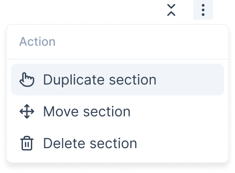 Actions on the section can be performed by clicking on the three dots icon on the section. The actions include: Duplicate, Move, Delete, and Collapse.