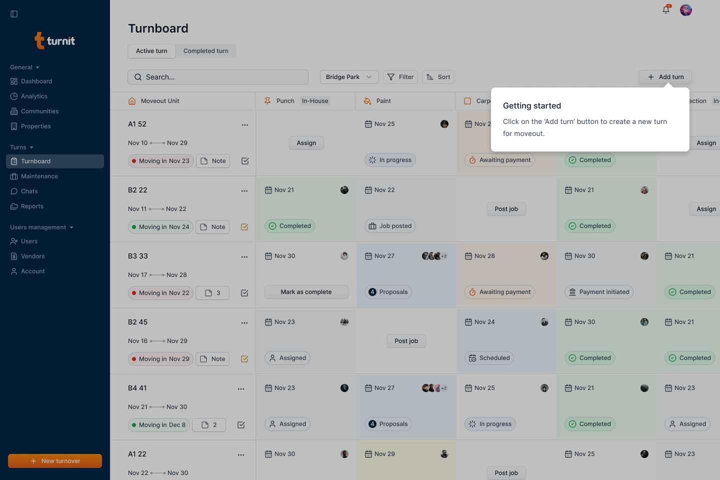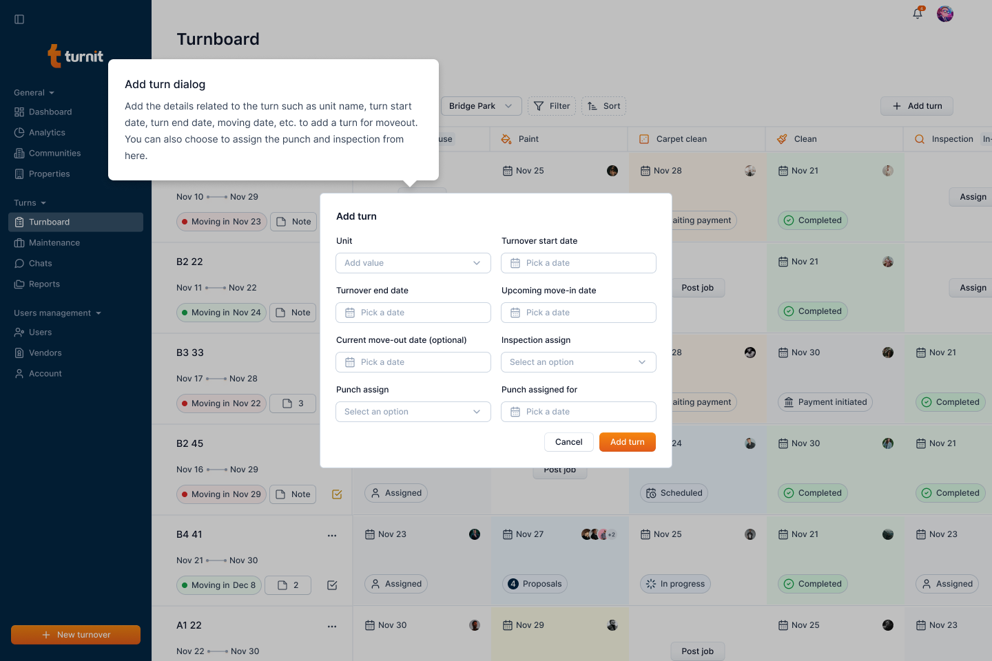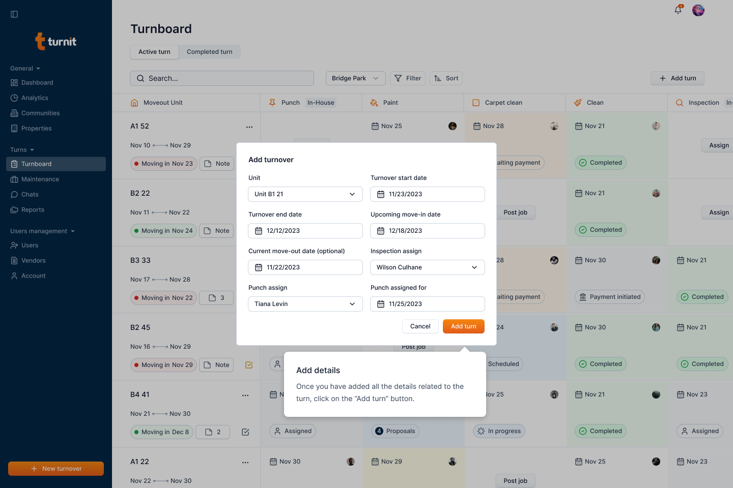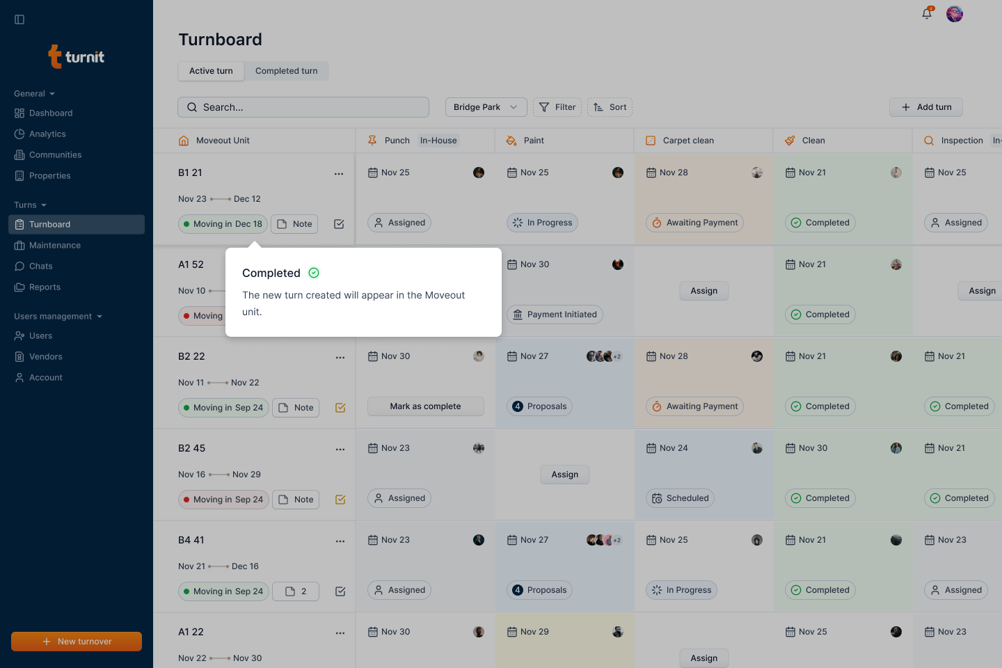 After submission, the newly created turnover will appear on the Turnboard, along with its assigned tasks and status.