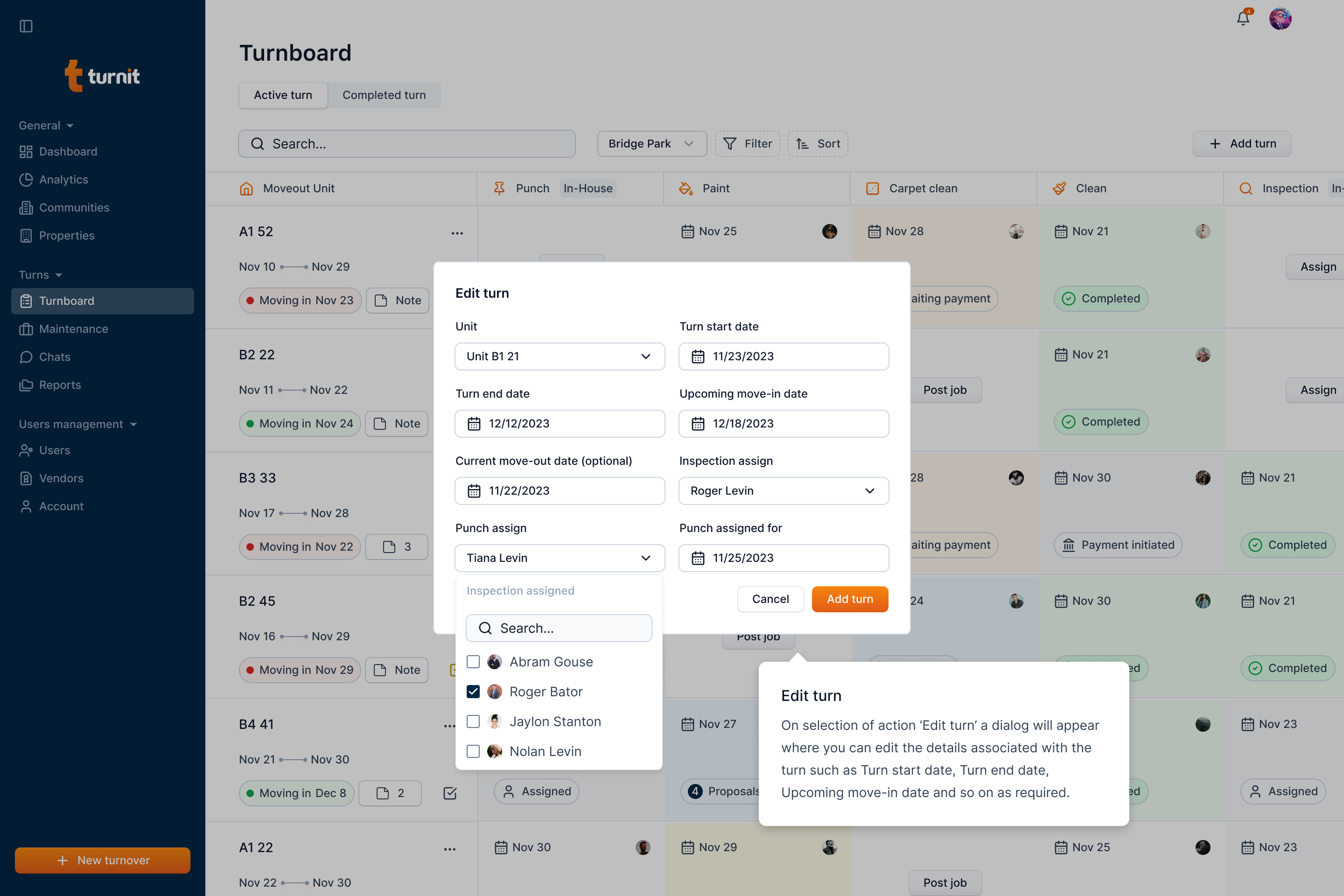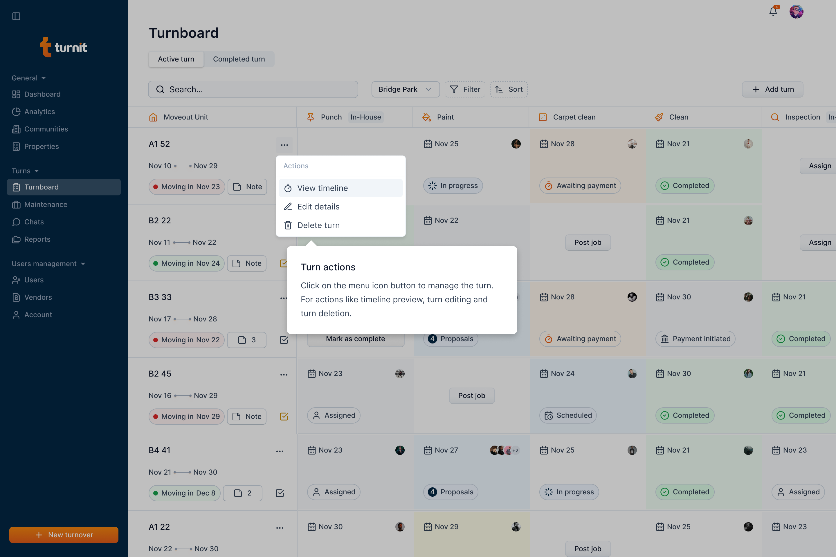 You can update information of the turnover after you have created the turnover. To start editing, click the three-dots icon in Moveout unit cell.