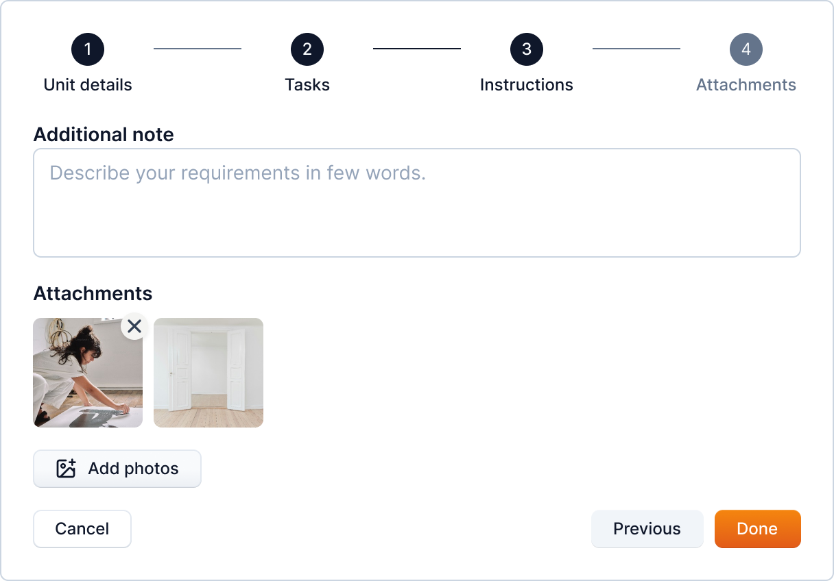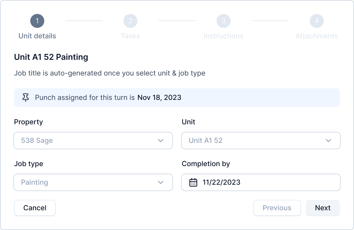 In the first step, you will get a form to select property, unit, job type and completion date. In the turnover post job form, property, unit and job type fields are disabled.