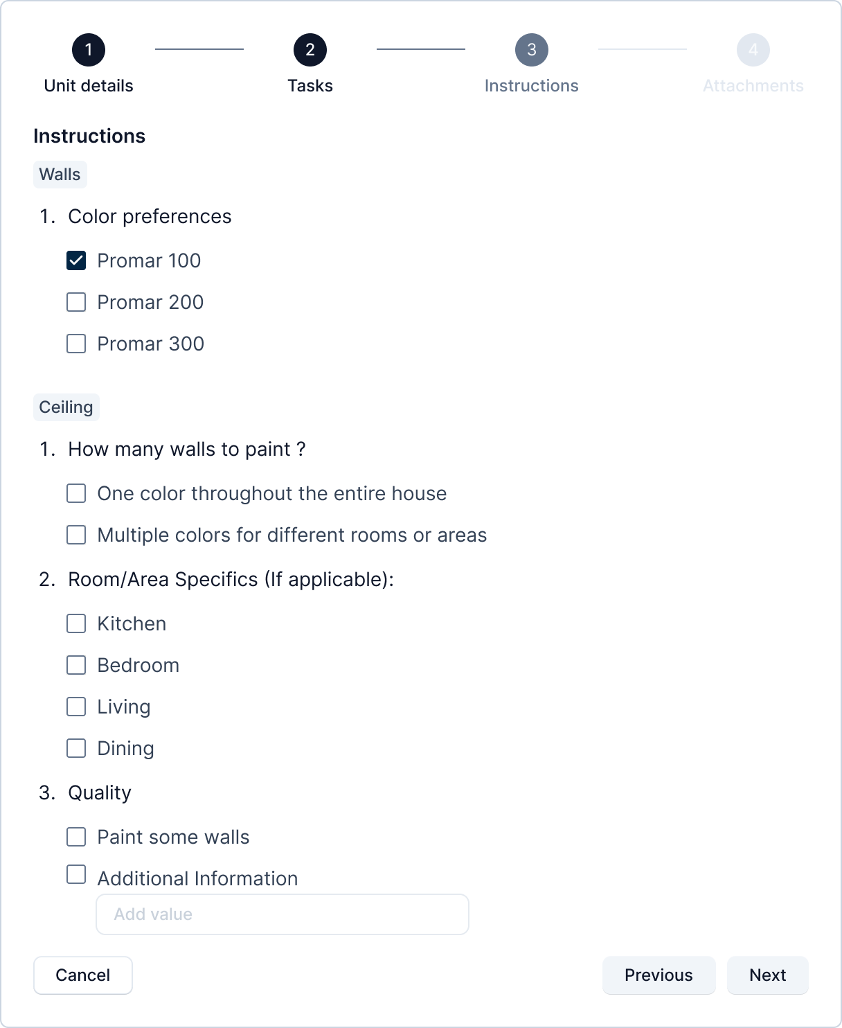 The concept of instructions is similar to that of a form. Here, a manager can set a form structure through community settings where, they define various sections, questions, options, and type of answers for the questions. When a job is posted on the community, the form is populated to the manager posting it. The filled form is then displayed to the vendors while viewing the job details. The instruction form looks as follows.