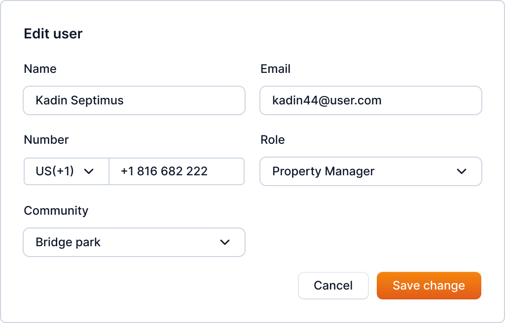 After clicking the button, a form will open in a popup. Here, you can edit the user's information like Name, Email, Number, Role or Community.